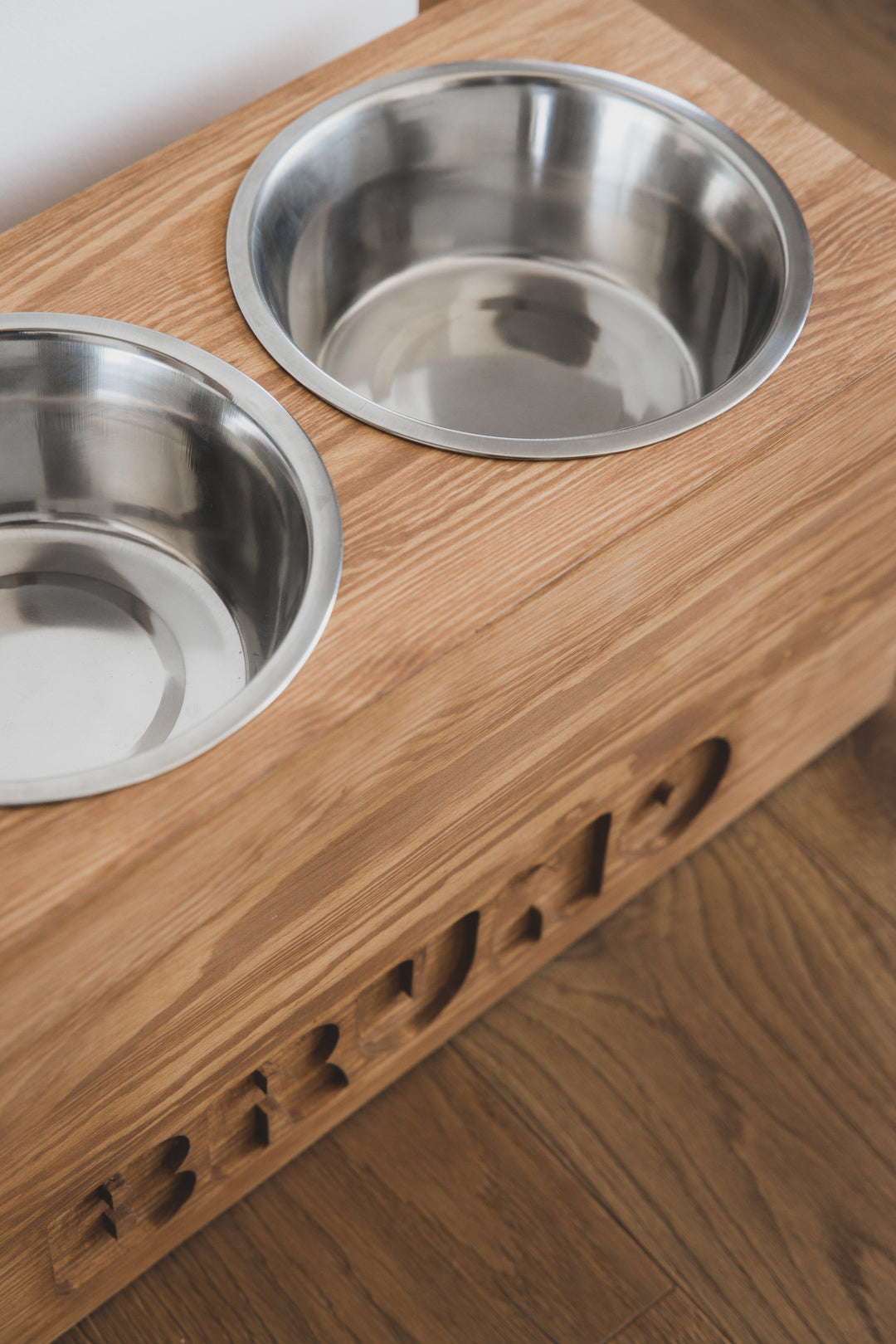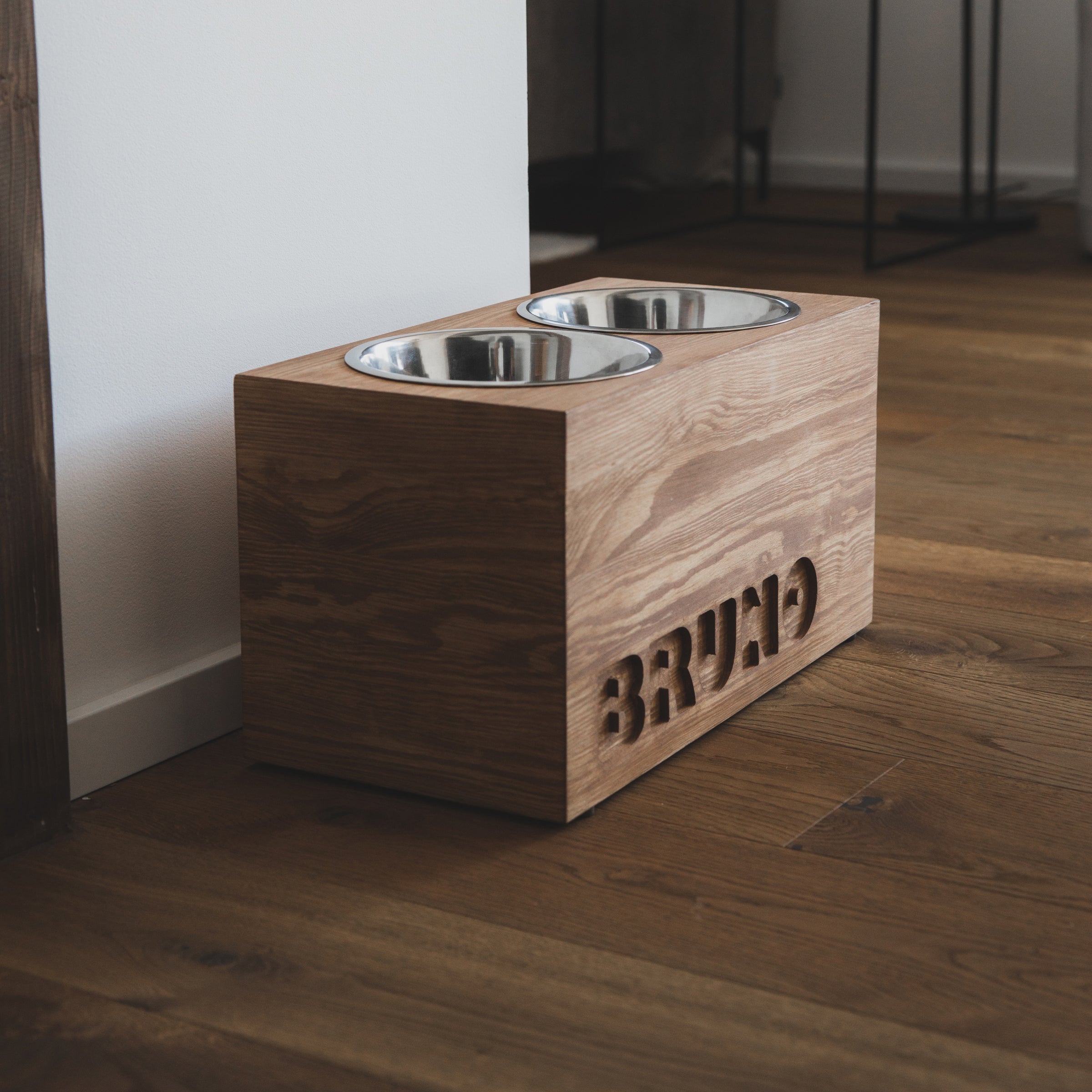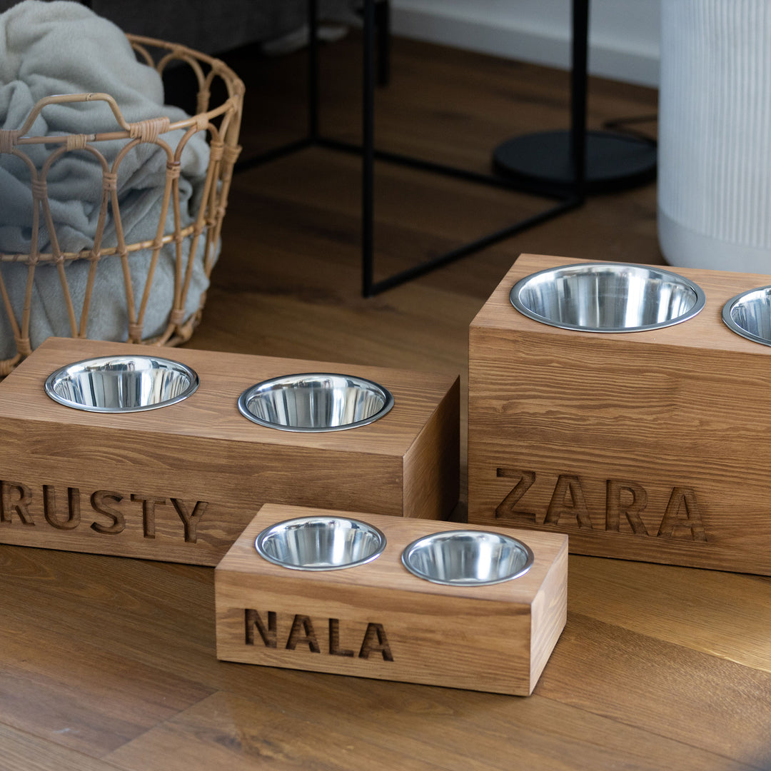 Unsere Futterstationen werden in der EU handgefertigt und sind wahre Unikate. Jedes Stück besteht aus hochwertigem Kiefernholz und wird sorgfältig und schadstofffrei lackiert, um Langlebigkeit zu gewährleisten. Rutschfeste Gummifüße und herausnehmbare Metallschüsseln sorgen für Stabilität und einfache Reinigung. Der Name deines Haustieres wird eingraviert – für eine persönliche Note und besonderen Stil.